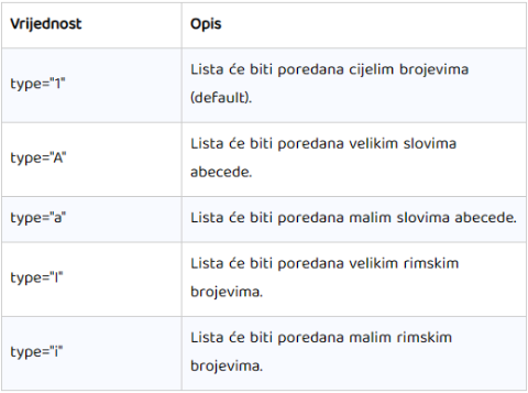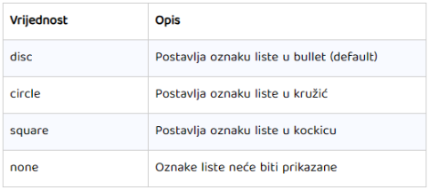 Da bi odredili kakvu oznaku želimo, koristimo css opciju: list-style-type: vrijednost;